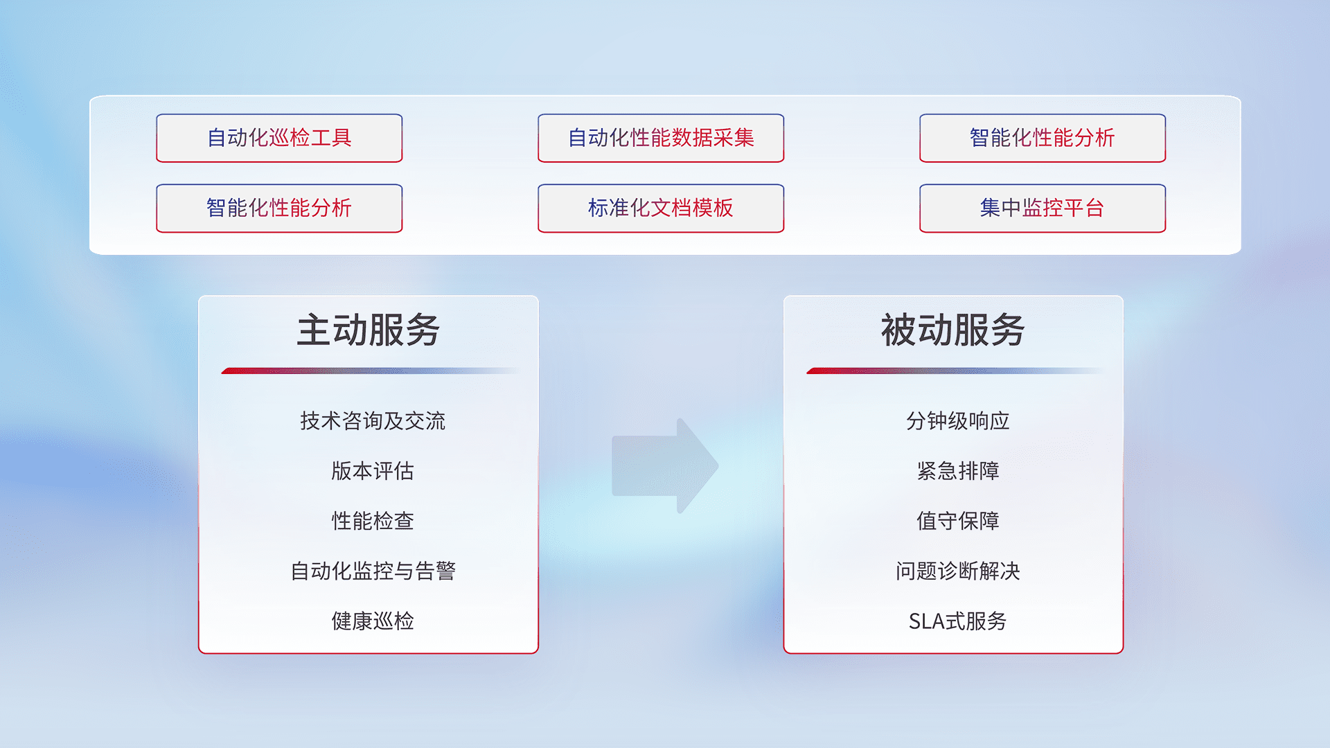 智能化工具和标准化文档,,,保障服务质量,,,,提供主动服务(包含技术咨询、、、版本评估、、、、性能检查、、、、自动化监控与告警、、、、健康巡检)和被动服务包含(分钟级响应、、、、紧急排障、、值守保障、、、问题诊断解决、、SLA服务)。。