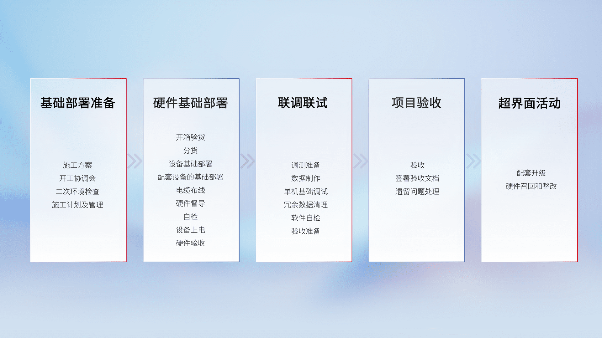 从基础部署准备、、、硬件基础部署、、、、联调联试、、、项目验收、、、、越界面活动的全过程可追溯,,保证施工质量和进度。。。